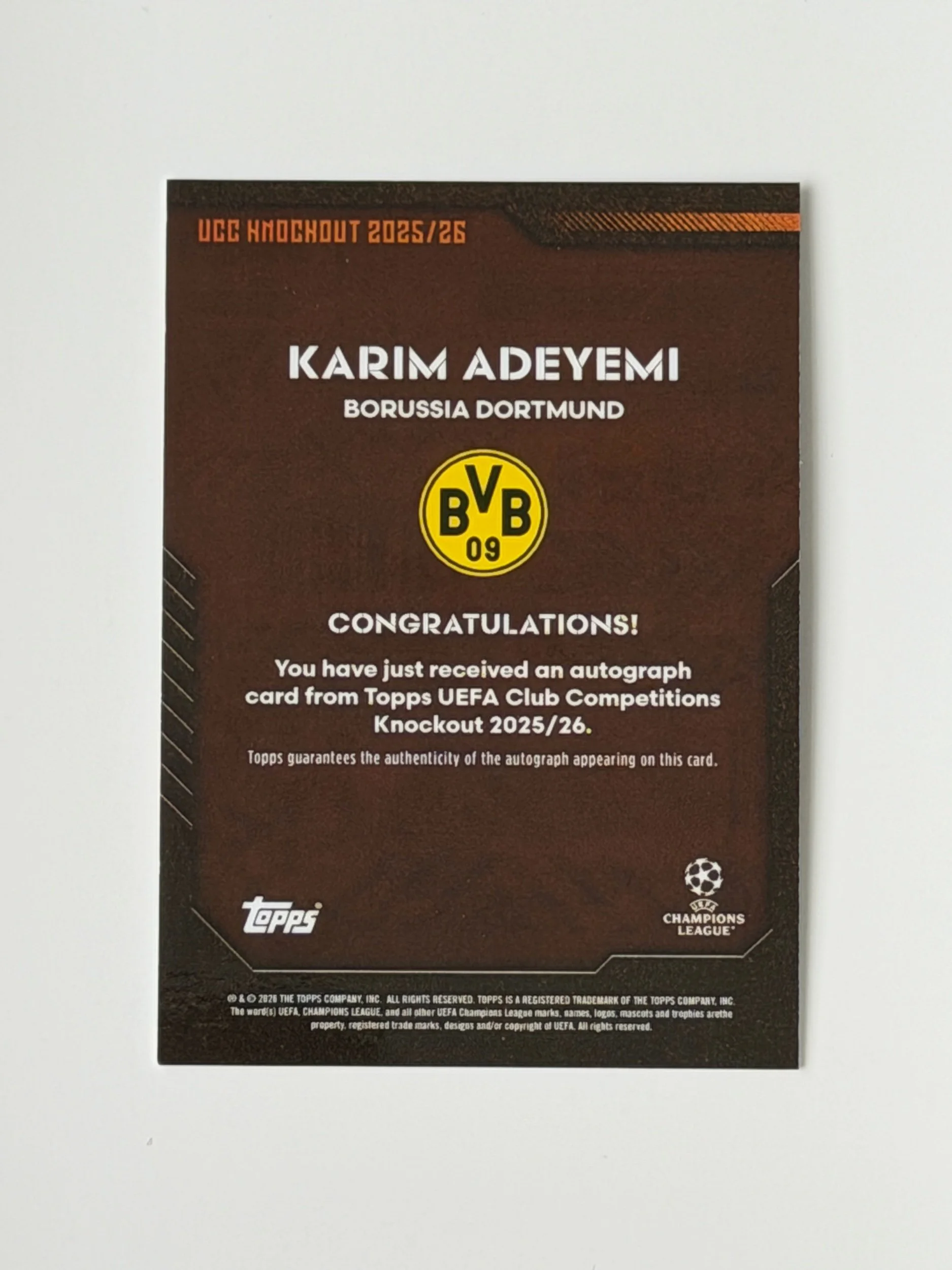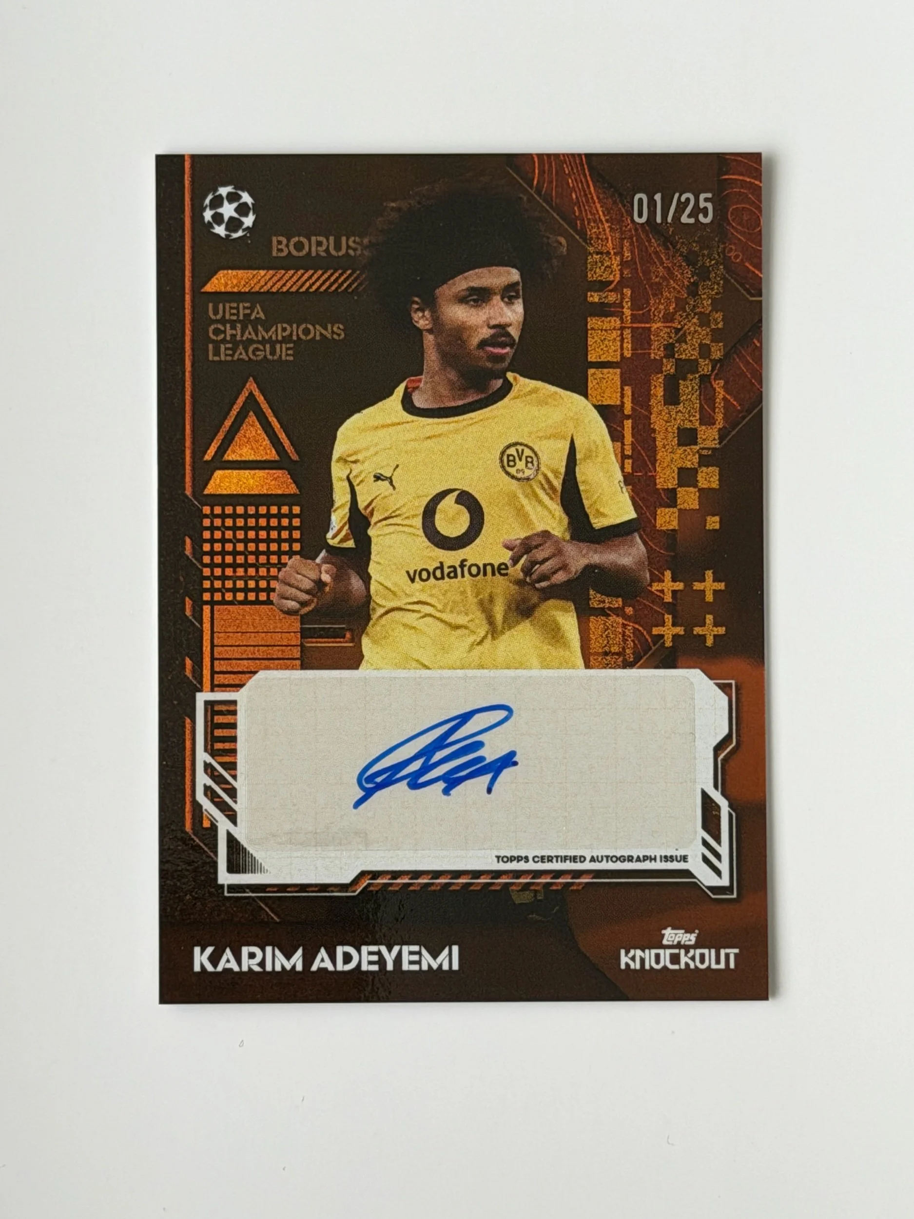 A low serial numbered autograph of Karim Adeyemi (/25), featuring a clean signature on a bold Knockout design. Crisp finish with strong detailing - a nice addition to any collection.