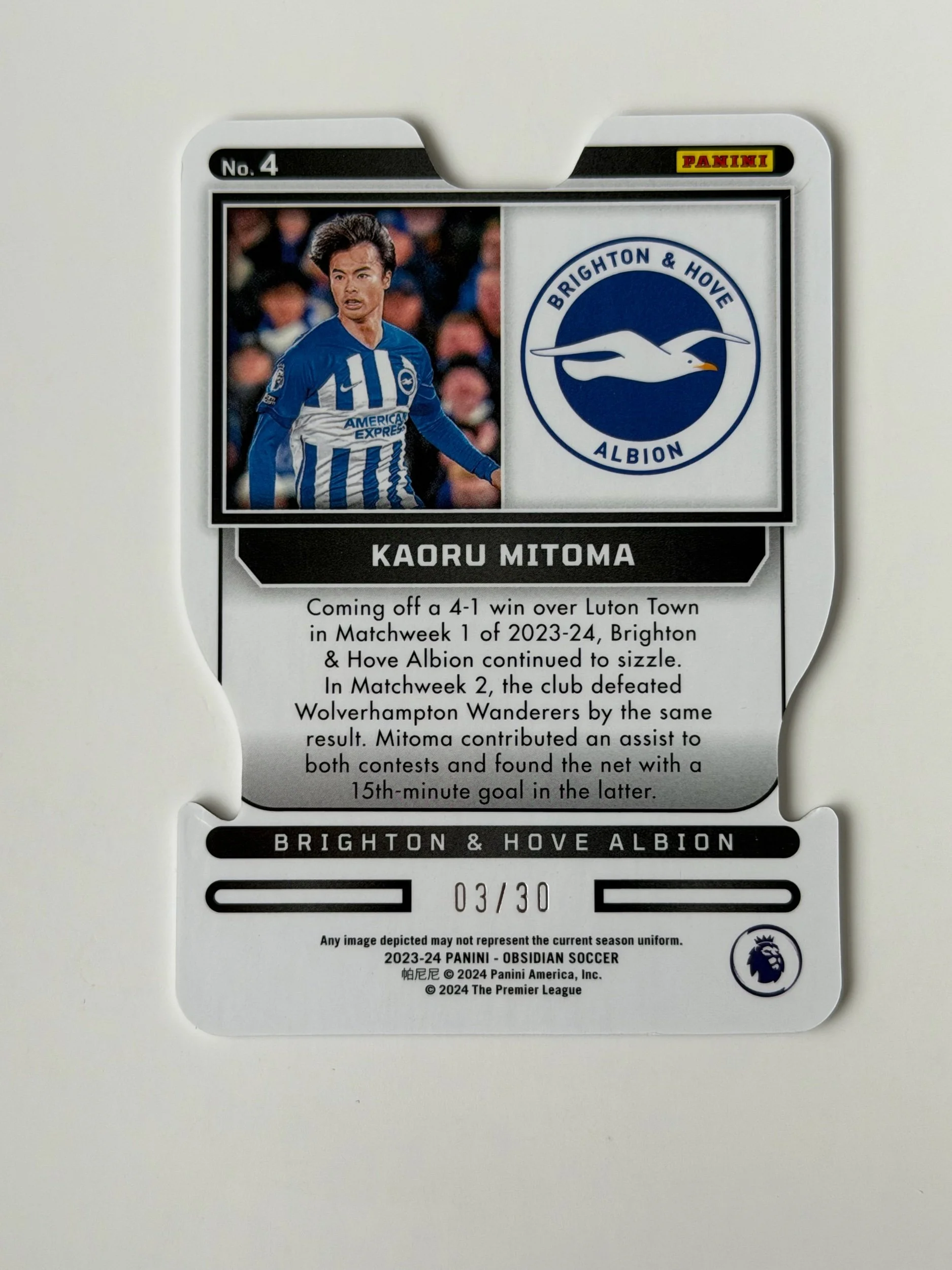 A low serial numbered Supernova Blue Electric Etch card of Kaoru Mitoma (/30), featuring a bold Obsidian finish with strong colour and detail. Eye-catching design with sharp presentation - a nice addition to any collection.