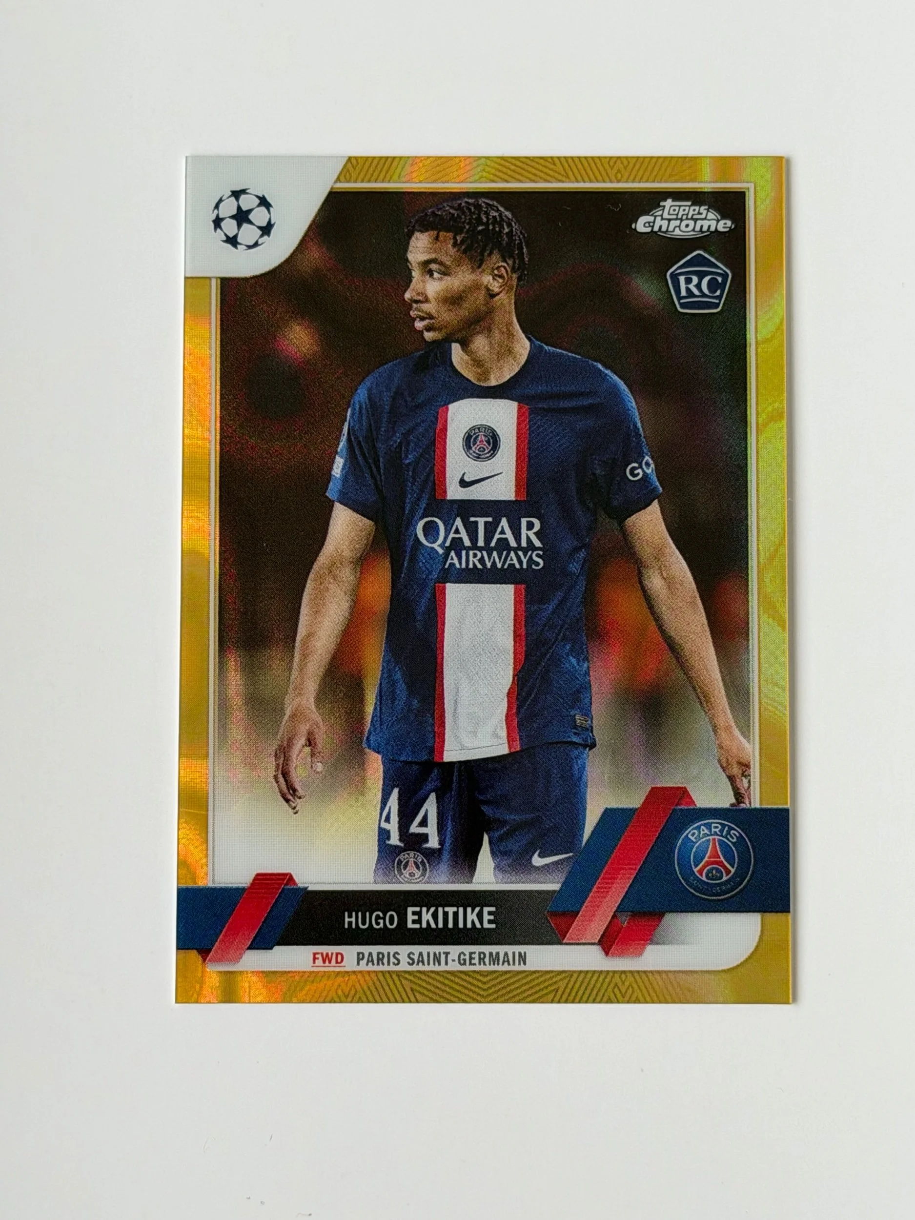 A Gold Lava rookie card (~40-50) of Hugo Ekitiké, finished on a sharp Chrome design with a distinct patterned look. Clean visual with strong detailing - a nice addition to any collection.