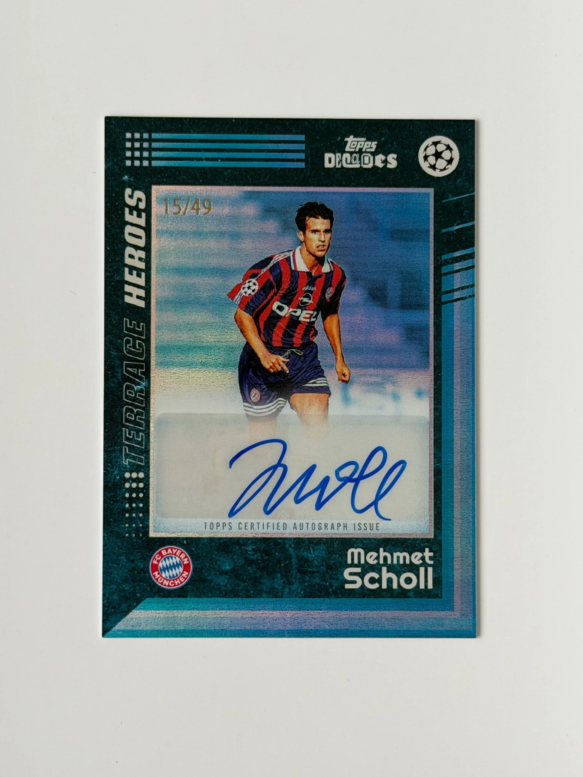 A serial numbered autograph of Mehmet Scholl (/49), featuring a clean signature on a 90’s Decades design. Sharp finish with strong detailing - a nice addition to any collection.