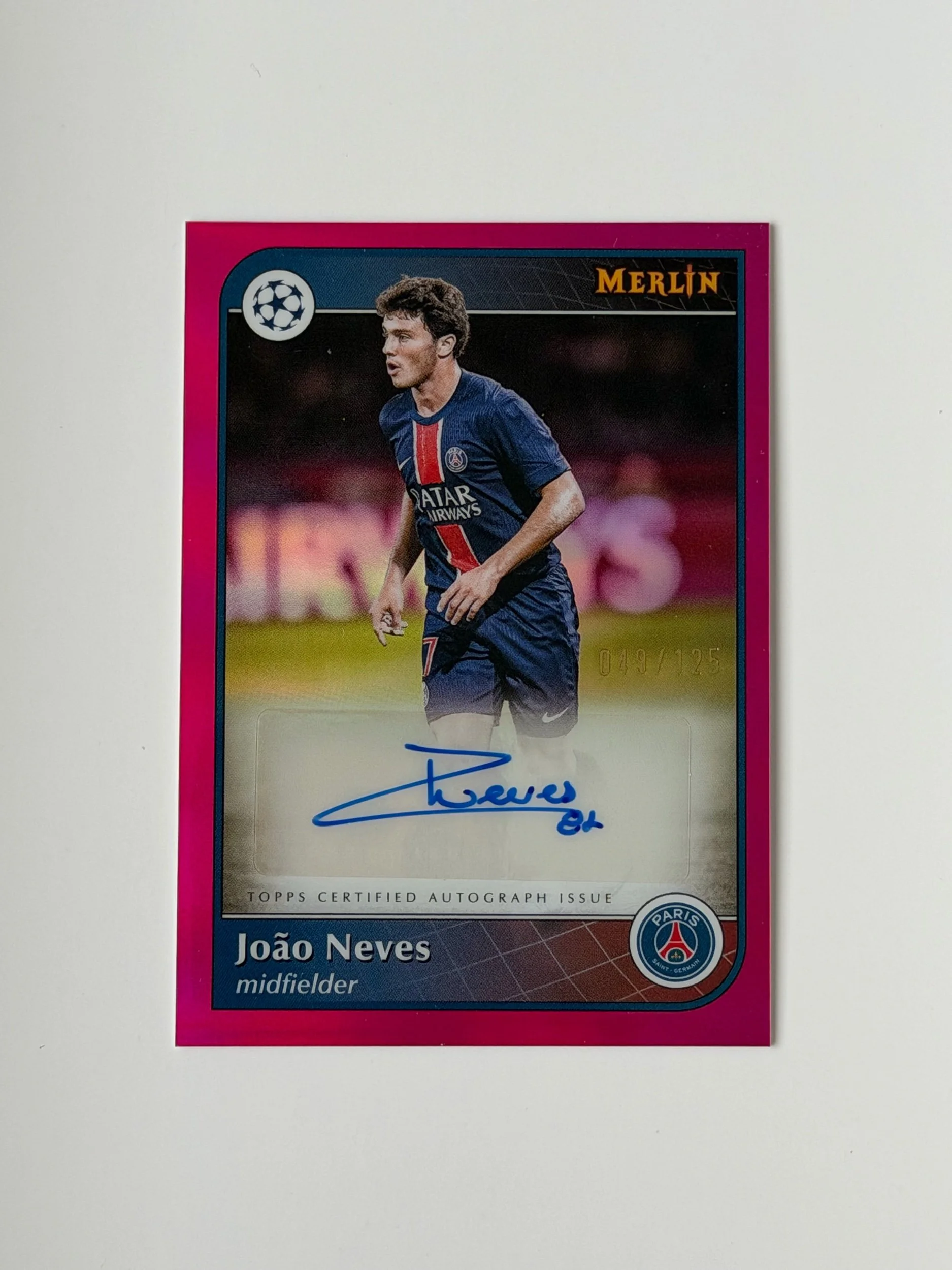 A serial numbered autograph of João Neves (/125), featuring a clean signature on a sharp Merlin design. Crisp finish with strong detailing - a nice addition to any collection.