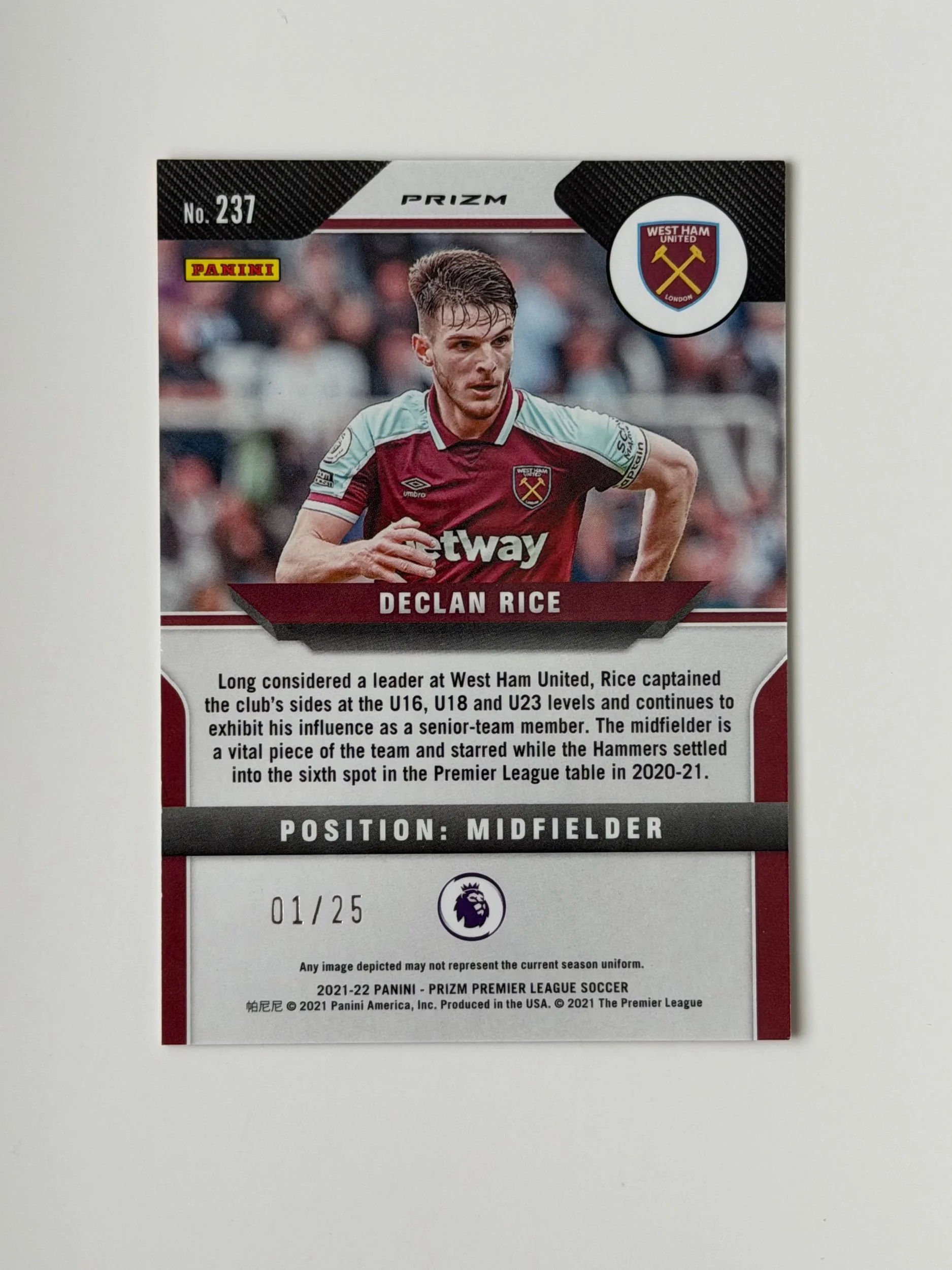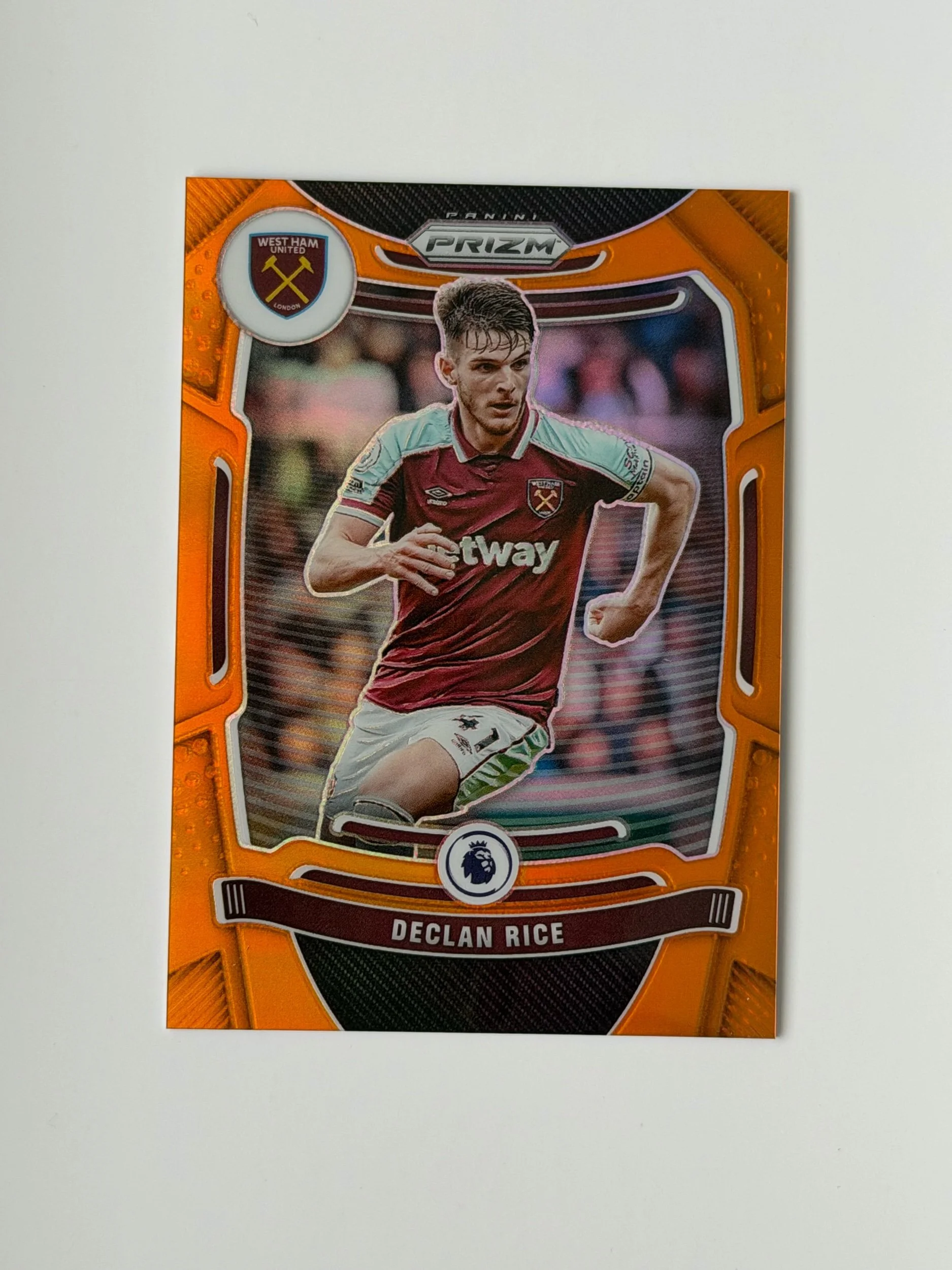 A low serial numbered Orange Prizm of Declan Rice (/25), featuring a vibrant finish with strong colour and detail. Bookend copy, marking the first card in the print run - a nice addition to any collection.