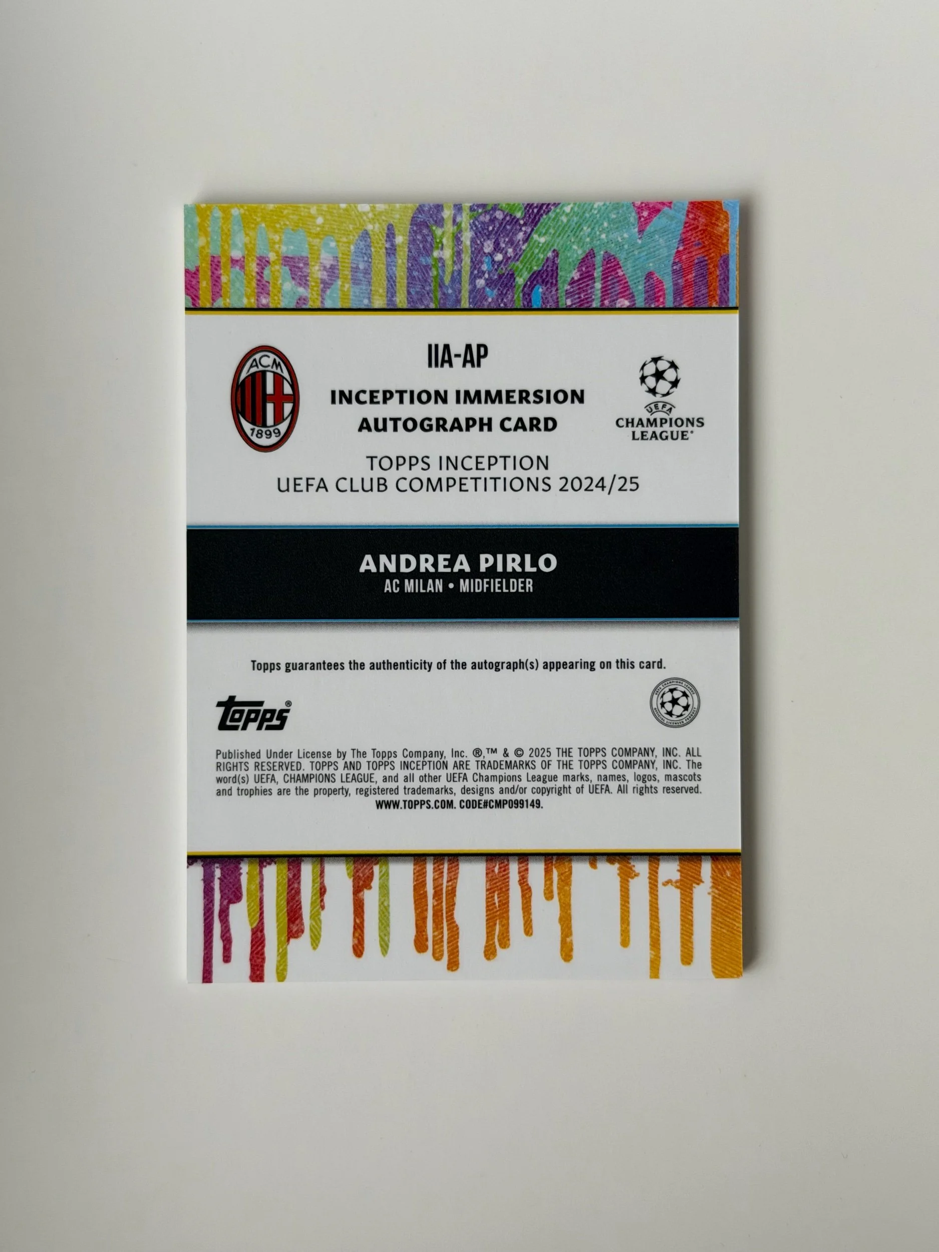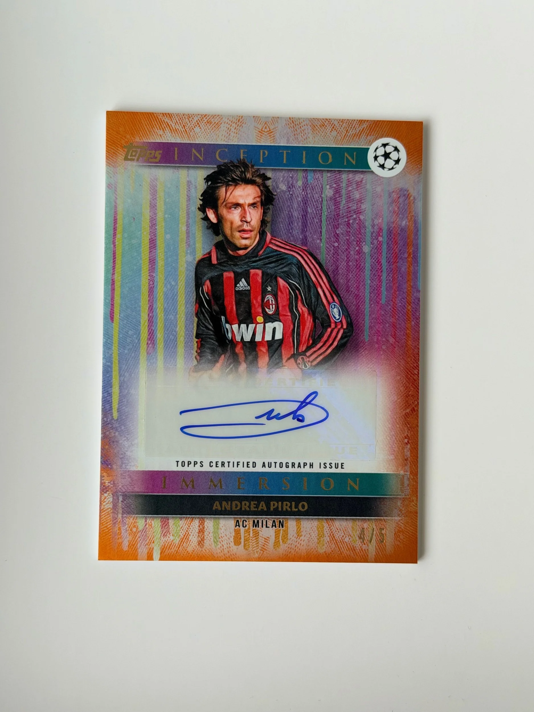 A low serial numbered autograph of Andrea Pirlo (/5), featuring a clean signature on a bold Inception design. Strong visual presence with sharp detailing - a nice addition to any collection.