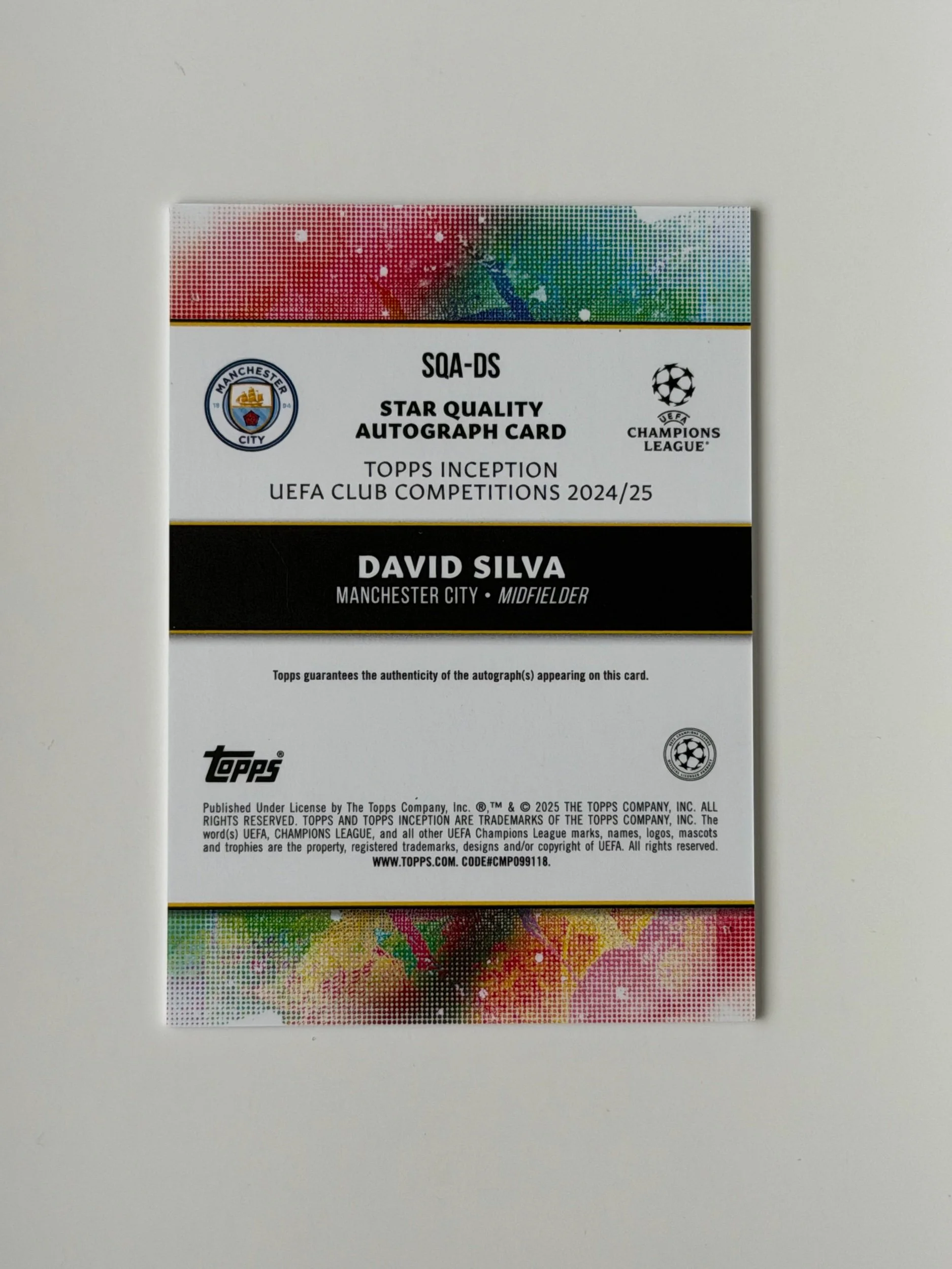 A serial numbered autograph of David Silva (/75), featuring a clean signature on a bold Inception design. Crisp finish with strong detailing - a nice addition to any collection.