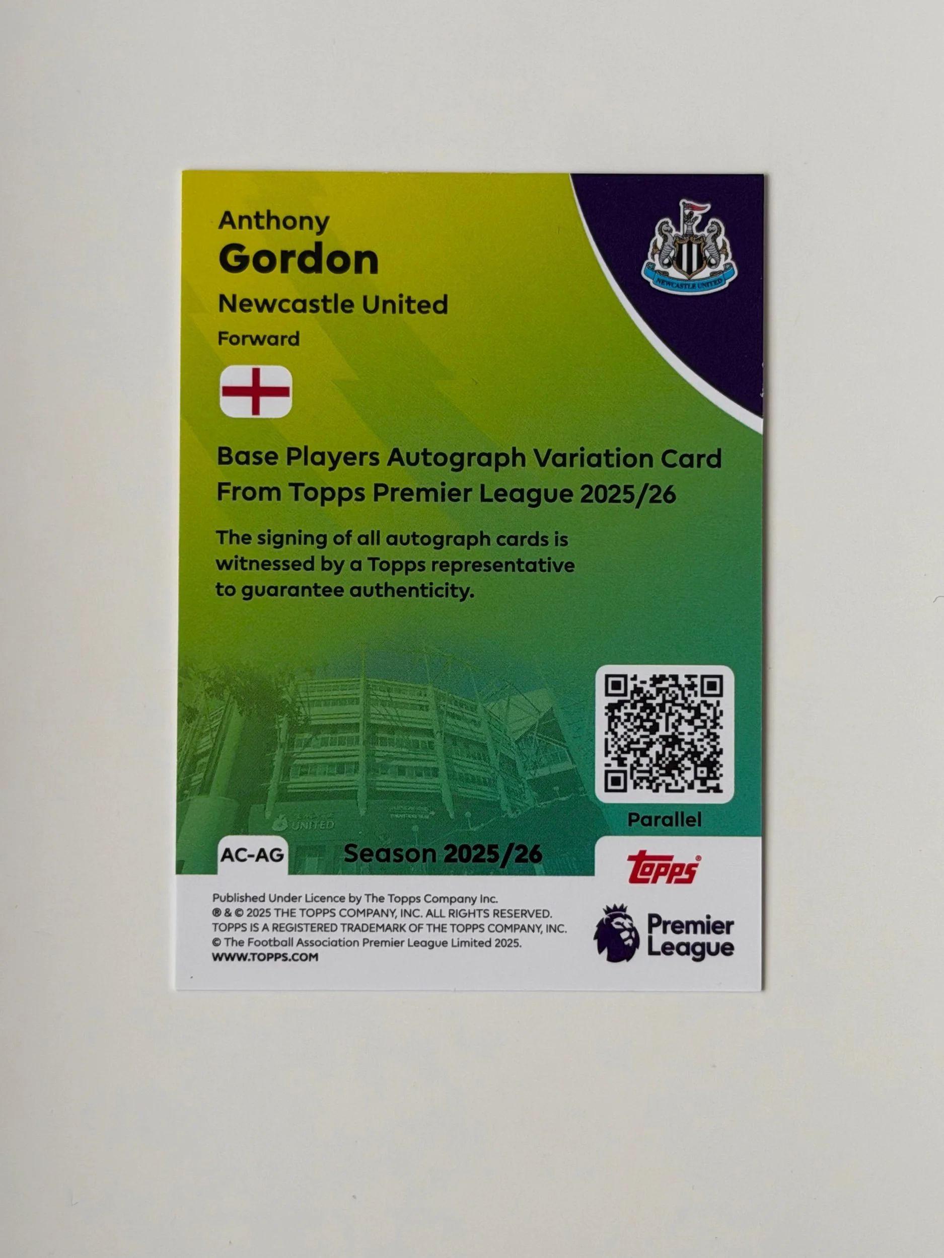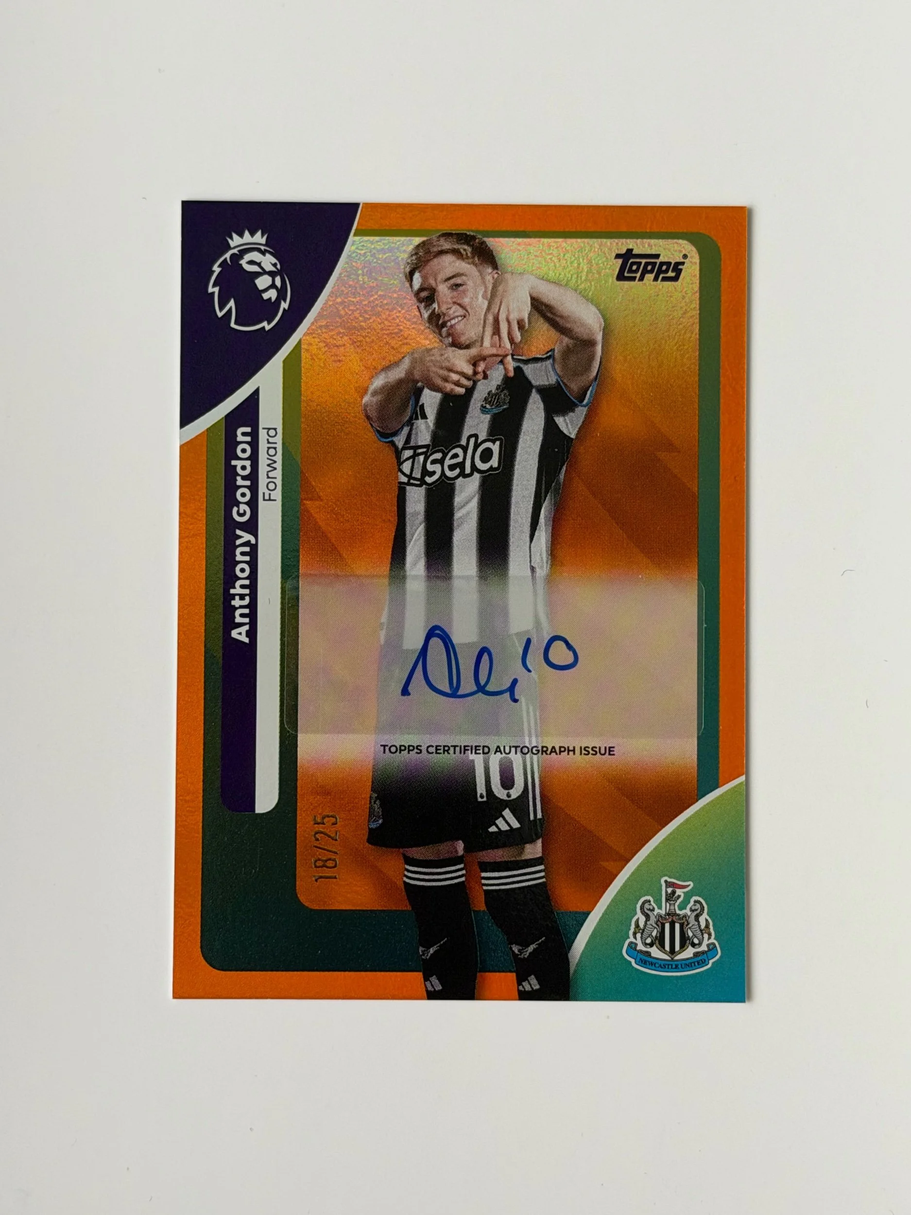 A low serial numbered autograph of Anthony Gordon (/25), featuring a clean signature on a sharp Premier League design. Crisp finish with strong detailing - a nice addition to any collection.