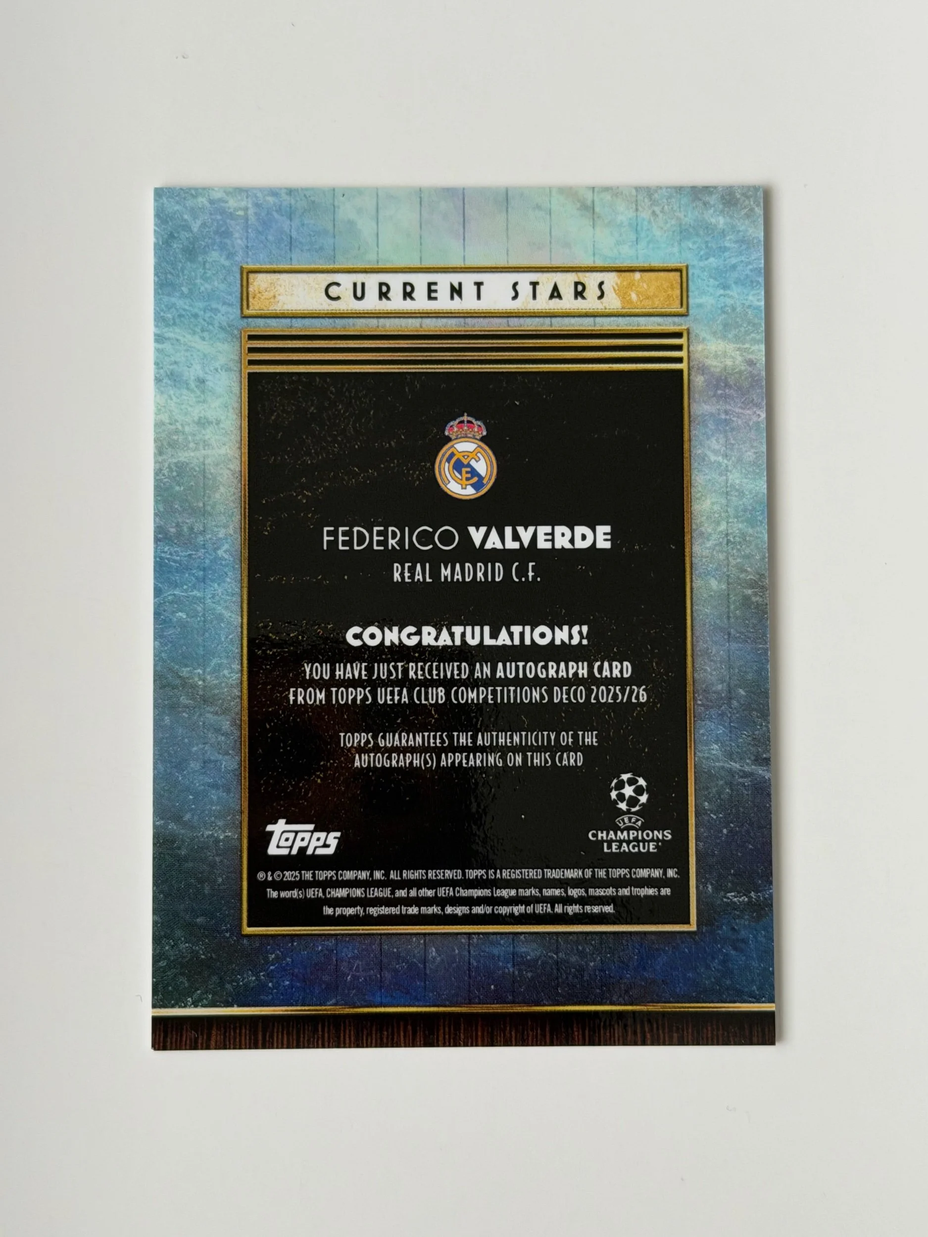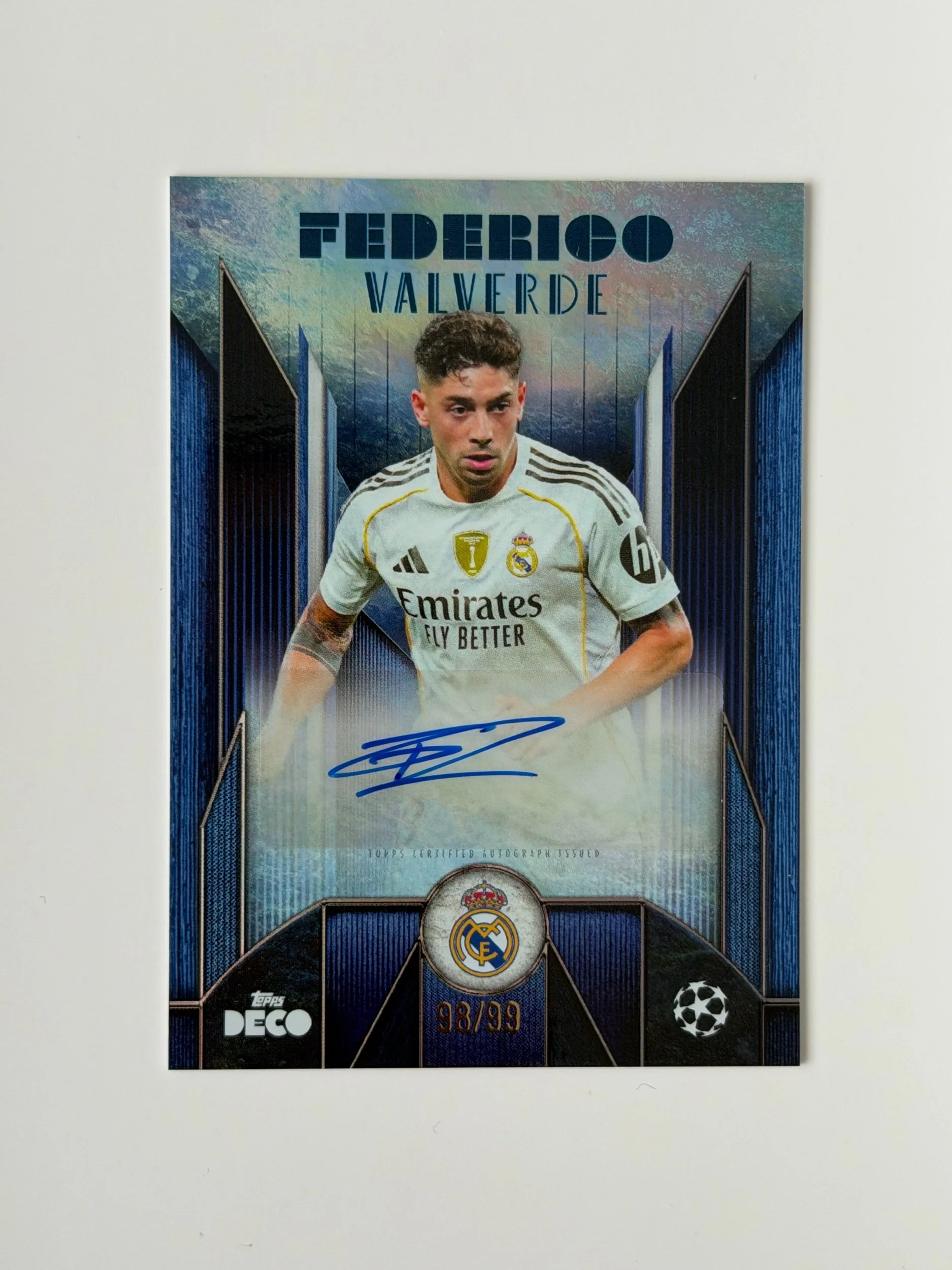 A serial numbered autograph of Federico Valverde (/99), featuring a clean signature on a distinctive Deco design. Bold finish with strong detailing - a nice addition to any collection.
