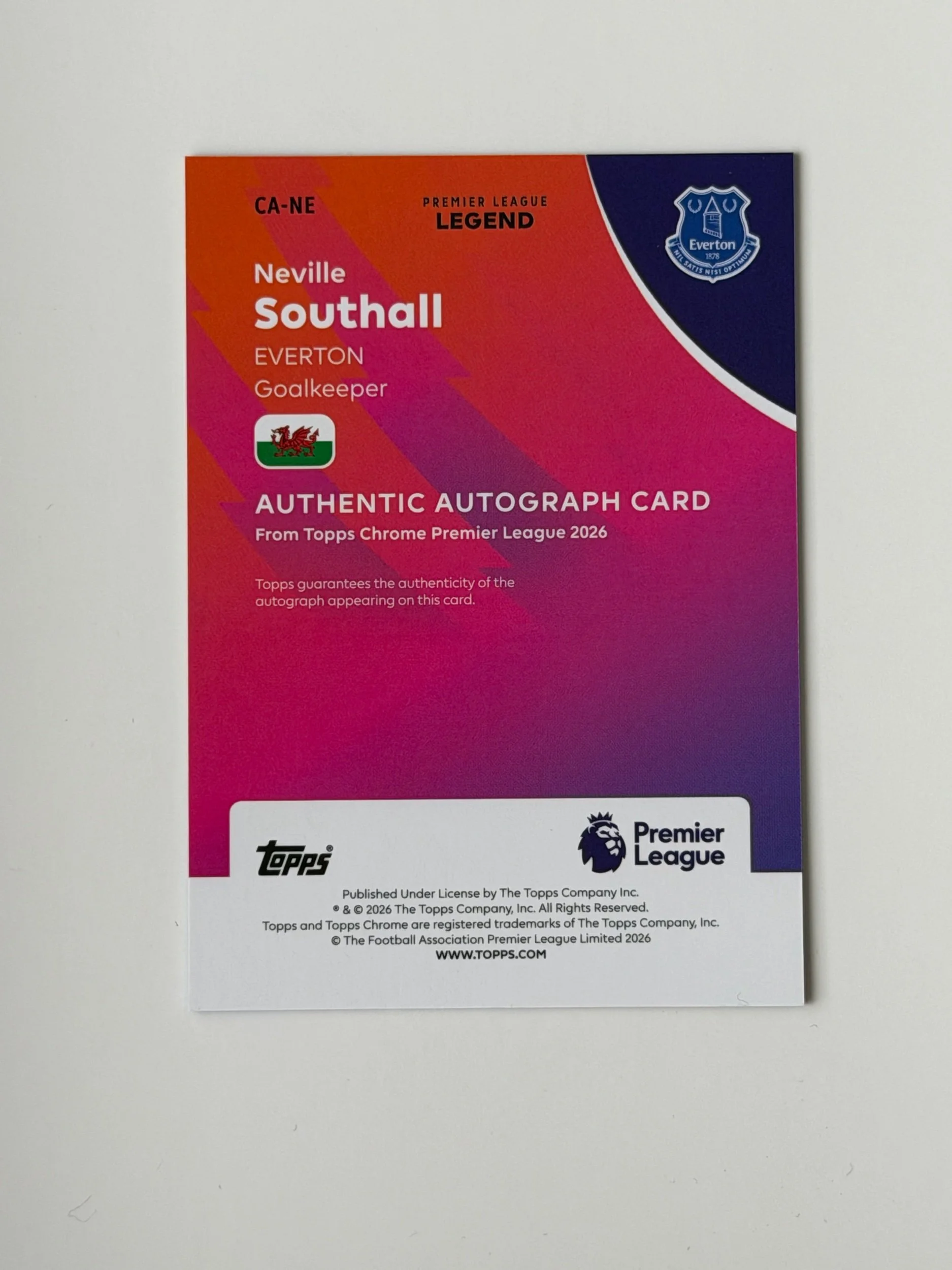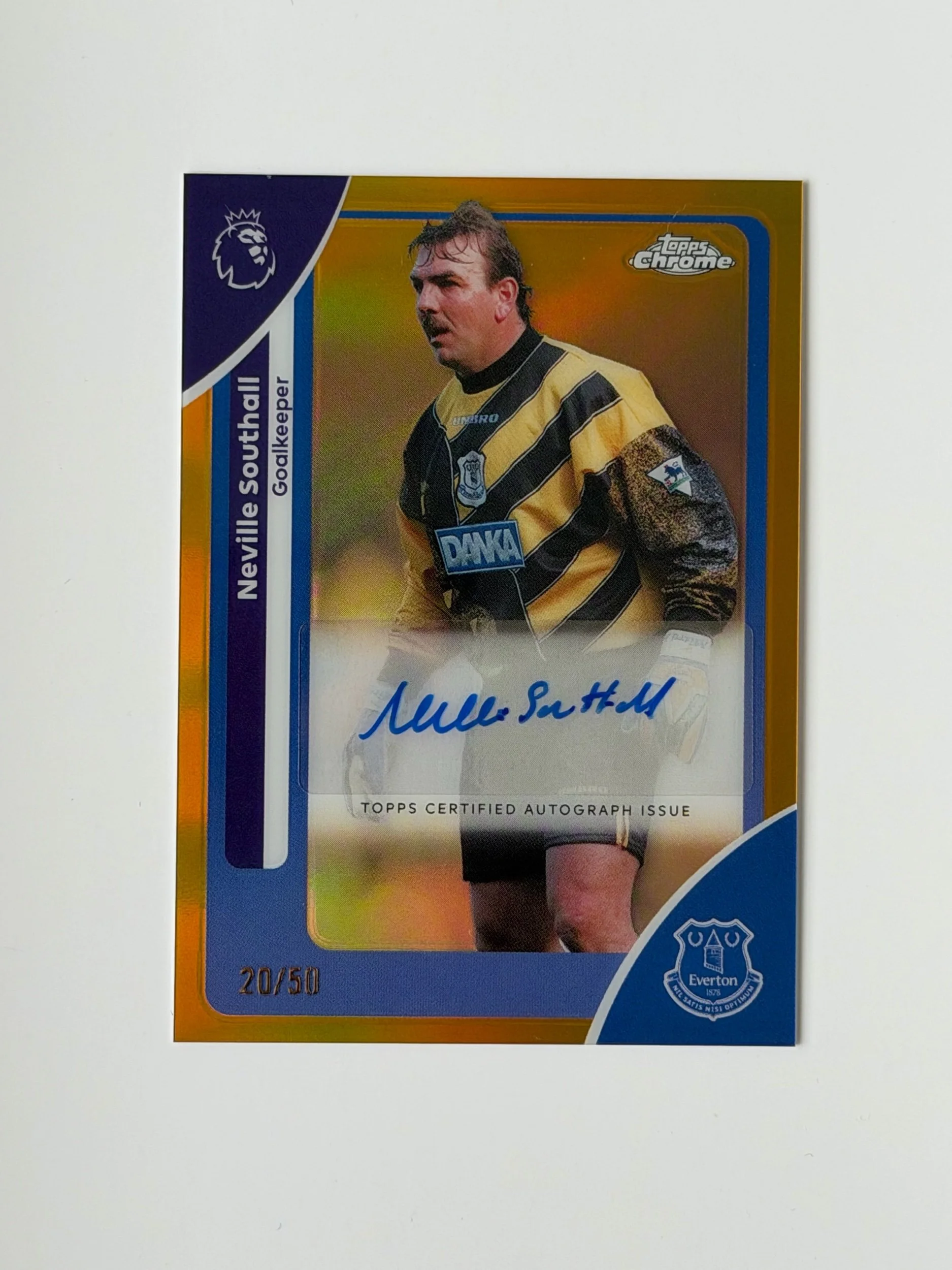 A serial numbered autograph of Neville Southall (/50), featuring a clear signature on a clean Chrome finish. Well-presented with a sharp design - a nice addition to any collection.