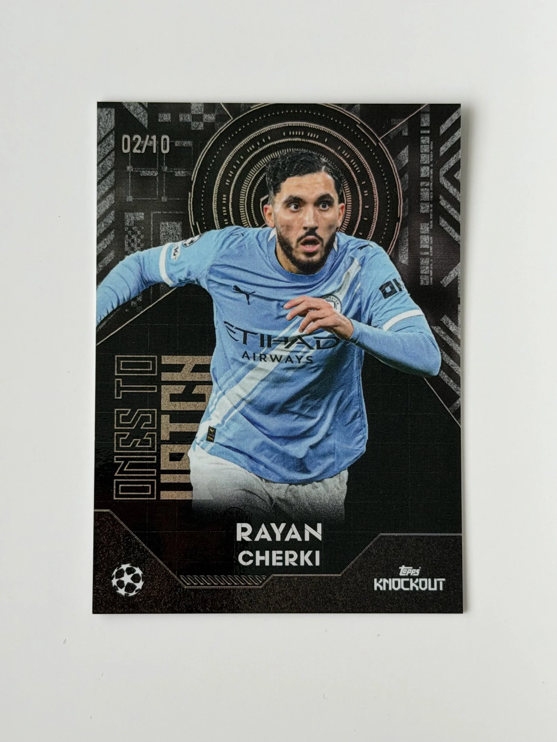 A low serial numbered card of Rayan Cherki (/10), finished on a bold Knockout design. Clean look with strong detailing - a nice addition to any collection.